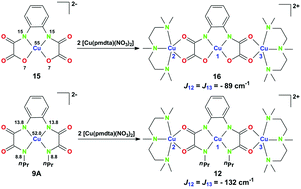 The origin of larger J values of trinuclear bis(oxamidato) versus bis(oxamato) type complexes is explained by an interplay with the spin densities of their mononuclear precursors.
