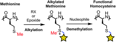 A methodology was developed for efficient, chemoselective transformation of methionine residues into stable, functional homocysteine derivatives. Methionine residues can undergo highly chemoselective alkylation reactions at low pH to yield stable sulfonium ions, which could then be selectively demethylated to give stable alkyl homocysteine residues. This mild, two-step process is chemoselective, efficient, tolerates many functional groups, and provides a means for creation of new functional biopolymers, site-specific peptide tagging, and synthesis of biomimetic and structural analogs of peptides.